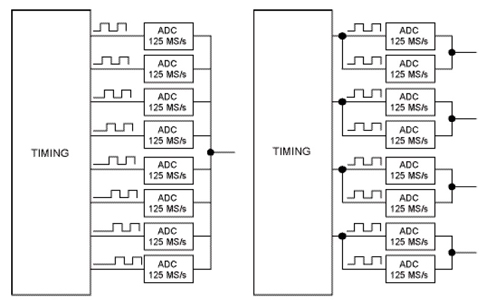 Наличие режимов объединения обеспечивает пользователю гибкость в выборе приоритета требуемого параметра, а также высокую адаптивность в решении конкретной измерительной задачи. Например, при объединении ядер АЦП для последовательного опроса входных каналов обеспечивается максимальная частота дискретизации, которая в одноканальном режиме достигает 1 ГГц при разрешении 8 бит (на рис. - слева).