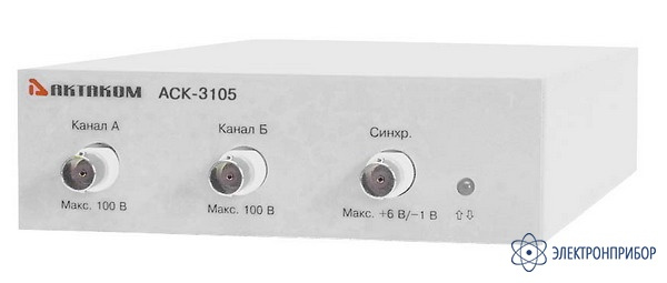 Виртуальный осциллограф АСК-3105 позволяют пользователю наблюдать форму сигнала, используя два независимых канала с разрешением 8 бит и чувствительностью от 2 мВ/дел до 10 В/дел в полосе частот от 0 до 100 МГц с аппаратным буфером на 131071 выборок для каждого канала. Входное сопротивление выбирается программно — 1 МОм или 50 Ом.