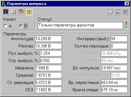 Программа имеет выдающиеся возможности автоматического определения стандартных параметров импульсных сигналов. Вычисления параметров проводятся по указанному участку сигнала.