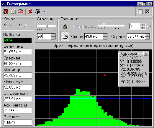 - P — вероятность попадания измеряемой величины в границы значений, обозначенные курсорами (по горизонтали);