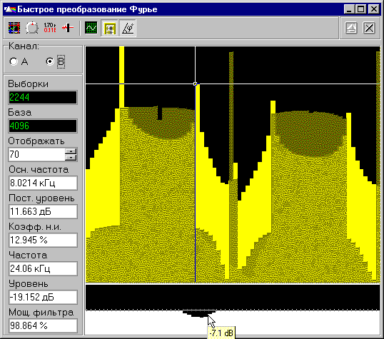 Большие возможности представляет использование спектрального фильтра. Для использования этой функции необходимо включить режим преобразования. В результате этого преобразования исследуемый сигнал представляется как суперпозиция гармонических колебаний с различными частотами, амплитудами и фазами. С помощью графических элементов панели Фурье-анализа пользователь может указать программе проводить обратное преобразование, предварительно удалив указанные компоненты сигнала. Спектральный фильтр будет действовать только на тот канал, для которого проводится быстрое преобразование Фурье.