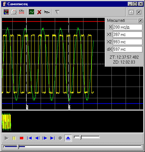 Основной график самописца - не масштабируемый графический элемент «лентопротяжного» типа. Отображает десятую часть полного буфера данных прибора (6553 выборок) с частотой 1 из 10 точек. Обзорный график самописца - не масштабируемый графический элемент «лентопротяжного» типа. Отображает полный буфер данных прибора (131071 выборок) с частотой 1 из 100 точек.