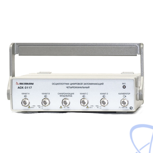 Цифровой осциллограф АСК-3117 позволяет пользователю наблюдать форму сигнала, используя четыре независимых канала с разрешением 8 бит и чувствительностью от 2 мВ/дел до 10 В/дел в полосе частот от 0 до 100 МГц с аппаратным буфером на 131071 выборок для каждого канала. Входное сопротивление выбирается программно — 1 МОм или 50 Ом.