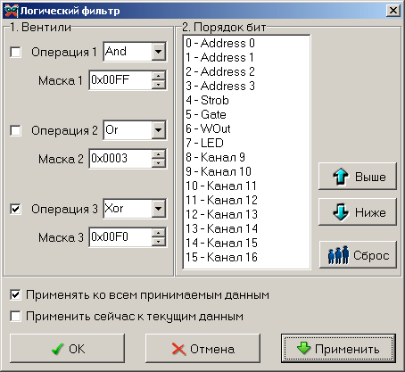 Позволяет применить ко всему массиву данных три последовательных логических операции (вентиля: And — побитовое «И», Or — побитовое «ИЛИ», Xor — побитовое «Исключающее ИЛИ») и произвольным образом переставить разряды (битовые каналы). Можно указать программе применять выбранный логический фильтр как ко всем новым получаемым данным, так и однократно применить его к уже собранным текущим данным.
