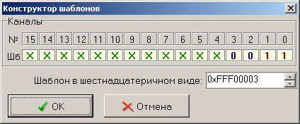 С помощью этого диалога Вы можете просто и наглядно собрать маскированный шаблон на 16 бит. Для каждого бита (от старшего 15 до младшего 0) выберите нужное состояние (окошко под номером бита): 0 — требуется нулевое состояние, 1 — требуется единичное состояние, X — не требуется анализировать состояние. Ниже полученный шаблон изображается в требуемом для программы виде 32-разрядного шестнадцатеричного числа. Нажмите кнопку «ОК» для подтверждения Вашего выбора или «Отмена» для возврата в предыдущее окно программы без передачи собранного шаблона.