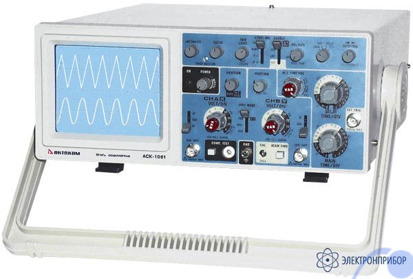 Осциллограф аналоговый - АСК -1051. 2 кананльный, 50 МГц. ЭЛТ 8х10см. Чувств. 1мВ-5В/дел, коэффициент развертки 0,1мкс-0,2с/дел. Максимальное входное напряжение 400В. Время нарастания 7нс. Режимы разверток автоколебательный, ждущий, телевизионный, Х-У. Источники синхронизации: СН1, СН2, сеть, внешний. Измерение ВАХ радиокомпонентов, Z-вход, задержка развертки, возможность рассмотреть подробнее сигнал с любого места экрана. Питание 220В.