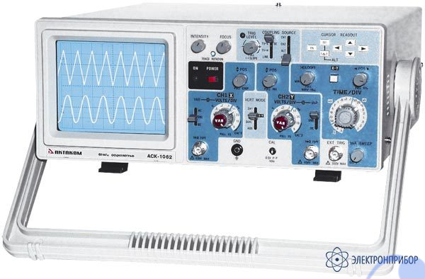 Осциллограф аналоговый - АСК-1052. 2 канальный, 50МГц. ЭЛТ 8х10см. Чувствительность 1мВ-5В/дел, коэффициент развертки 0,1мкс-0,2с/дел. Максимльное входное напряжение 400В. Время нарастания 7нс. Режимы разверток: автоколебательный, ждущий, телевизионный, Х-У. Источники синхронизации: СН1, СН2, сеть, внешний. Курсорные измерения, задержка развертки. Питание 220В.