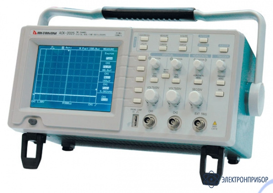 Цифровой осциллограф АСК-2025: 2 канала, полоса пропускания 25 МГц, дискретизация 100 МГц (2 канала), память 25 КБ, чувствительность 5 мВ/дел ... 5 В/дел, максимальное входное напряжение 400 В, входной импеданс 1 МОм/20 пФ; гор. развертка 25 нс/дел ... 5 с/дел, 5 автоизмерений, курсорные измерения, память на 2 осциллограммы, режимы разверток: автоколебательный, ждущий, однократный, X-Y, предзапись; источники синхронизации: СН1, СН2, ТВ, сеть, внешний; ч/б ЖКИ 5,7", 320x240, габариты 145х340х185мм; масса 3,5 кг.