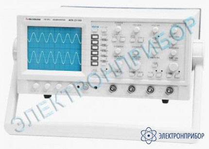 Аналоговый осциллограф АСК-21103: 2 канала, полоса пропускания 100 МГц, ЭЛТ 8х10 см, чувствительность 2 мВ/дел ... 5 В/дел, коэффициенты развертки 0,05 мкс/дел ... 0,5с/дел, максимальное входное напряжение 400 В, время установления 3,5 нс, входное сопротивление 1 МОм, входная емкость 25 пФ; режимы разверток: автоколебательный, ждущий, телевизионный, однократный, сложение сигналов ADD, X-Y; источники синхронизации: СН1, СН2, сеть, внешний; дополнительные функции: автоустановка, квазиэлектронное управление, курсорные измерения, задержка развертки, Z-вход; питание: 220 В; габариты: 328х153х392 мм; масса 8 кг.