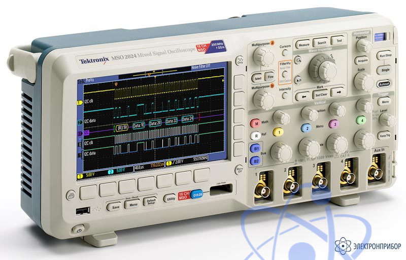 Цифровой осциллограф MSO2024: Полоса пропускания 200 МГц; 4 аналоговых канала и 16 цифровых; Дискретизация: до 1 ГГц (аналоговые каналы) / 1 ГГц (цифровые входы с D7-D0)/500 МГц (цифровые входы с D15-D8); Длина записи 1 миллионов точек на всех каналах.