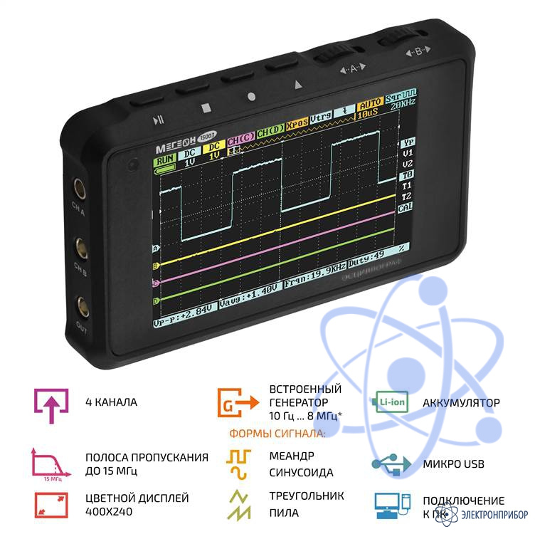 МЕГЕОН 15003 - это портативный четырёхканальный осциллограф на базе 32-битной платформы, способный решить широкий круг задач в т.ч. промышленных, инженерных, исследовательских, любительских и др.
