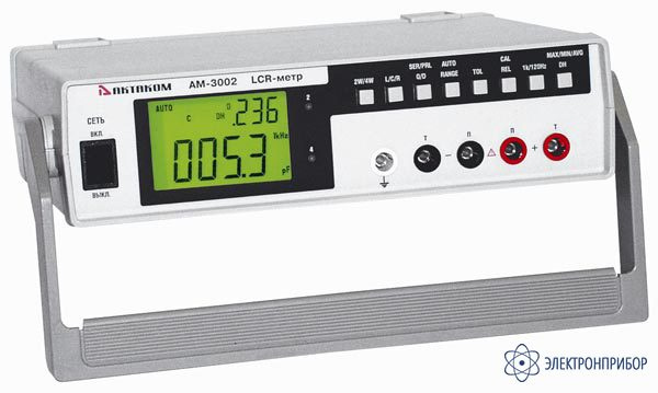 Измеритель LCR стационарный АМ-3002: измерение емкости 0,1 пФ ... 10 мФ, индуктивности 0,1 мкГн ... 10 кГн, сопротивления 1 мОм ... 10 МОм, добротности, тангенса угла потерь, две измерительные частоты 120 Гц, 1 кГц, базовая погрешность 0,3%; дополнительные функции: ЖКИ двустрочный, удержание показаний, относительные измерения, удержание максимального минимального и среднего значений, автоотключение, сортировка по допуску 1%, 5%, 10%, автоматическое и ручное переключение диапазонов, измерение по параллельной и последовательной схемам, двух и четырехпроводная схема измерений; питание 220 В; габариты 260х210х70 мм; масса 1,64 кг.