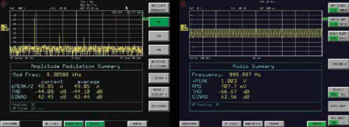 Измерение сигналов с AM, ЧМ или ФМ выполняется в режиме анализатора модуляции. FSMR отображает демодулированный или входной сигнал не только во временной области, но и в виде ВЧ спектра. Прибор позволяет измерять такие стандартные параметры, как коэффициент модуляции, девиация и частота модуляции, модуляционные искажения или АЧХ. Параметры звукового (аудио) сигнала измеряются либо на демодулированном сигнале, либо на сигнале, поступающем на звуковой вход, с возможностью селективного отображения гармоник и паразитных составляющих. Для анализа звуковых сигналов можно использовать различные имеющиеся аудиофильтры, цепи предыскажения и детекторы. Для измерения нелинейных искажений (THD) и SINAD, прибор автоматически настраивается на частоту основной гармоники.