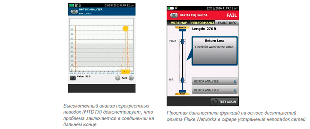 DSX сокращает время, необходимое для устранения неполадок в кабельных системах, при помощи специально предназначенной для этого диагностики — нажатия одной кнопки достаточно для выполнения всех необходимых тестов и сохранения полученных данных. Экран графических результатов позволяет «рассмотреть» кабель и определить точное местоположение перекрестных наводок, возвратных потерь и неисправностей экранирования на любой из линий. В отличие от предыдущих тестеров, которые имели частотные ограничения диагностических возможностей в 250 МГц, приборы серии DSX CableAnalyzer не имеют никаких ограничений. Это общее представление легко интерпретируется как новичками, так и опытными пользователями, для быстрого выявления каких-либо отрицательных результатов и принятия мер, и оно хранится с результатами тестирования для удаленного анализа.