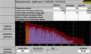 Частотные измерения: АЧХ, спектр шума, скоростной потенциал линии. Скоростной потенциал сравнивается с расчетной скоростью для данной длины и типа кабеля. В случае занижения скорости прибор проводит анализ причин: из-за высокого уровня помех или из-за аномально высокого затухания в линии.