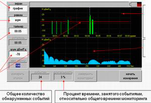Импульсные помехи: прибор автоматически или измеритель сам задает порог спектральной плотности шума, выше которого прибор фиксирует спектр помех и выводит его на экран из любого места графика суточного мониторинга помех.