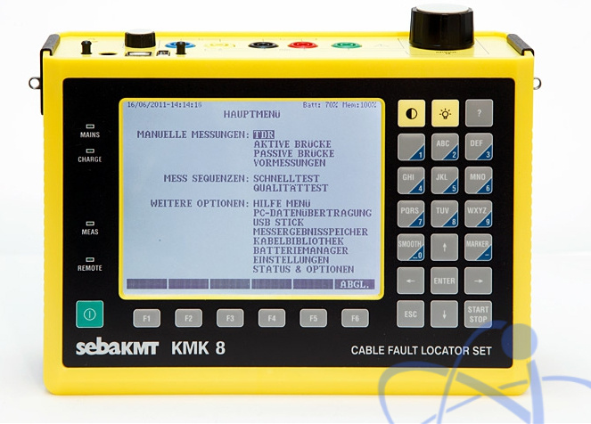 Прибор KMK 8 рассчитывает из предварительно запрограммированных или определенных пользователем кабельных параметров, а также из установленной или измеренной температуры кабеля, расстояние до места повреждения, а также длину кабеля.