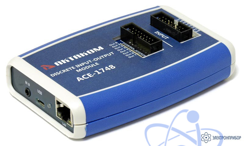 АСЕ-1748 USB / LAN модуль дискретного ввода - вывода 8 канальный предназначен для дистанционного контроля состояния датчиков (датчики имеющие значения на выходе – включено или выключено) и управления устройствами с дискретными входами, которые могут коммутироваться однопозиционными реле. Все входы выходы гальванически развязаны от внутренней схемы АСЕ-1748 USB / LAN модуля дискретного ввода – вывода. Модуль имеет 8 выходов и 8 выходов. Все входы и выходы имеют индикацию состояния – включено.