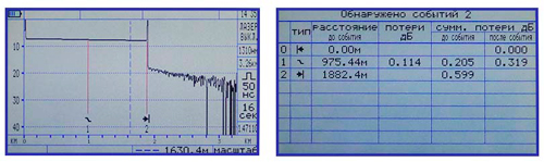 - Автоматический анализ рефлектограмм в табличной форме с указанием событий, типов событий в виде пиктограмм, расстояний до событий, потерь в дБ до событий и после событий;