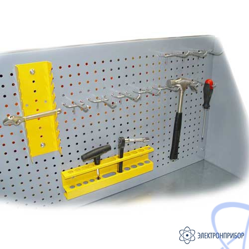 Крючки изготовлены из 4 мм стальной проволоки с полимерным покрытием. Держатель для отверток ДО-01 и держатель для ключей ДК-01 из 1 мм металла, цвет RAL 1003 (желтый) или RAL 7012 (серый). Крючки навешиваются на перфорированную панель. Служит для размещения различного инструмента. Масса набора 1 кг.