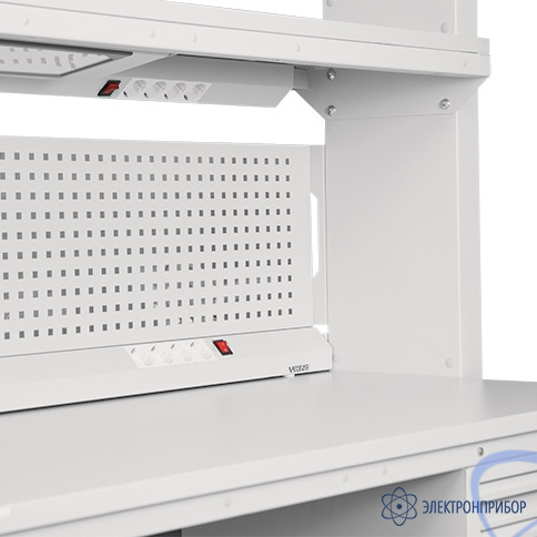 Основная панель ГМ-ЭПА-18 может крепиться на столешницу лицевой стороной вперед или назад. Алюминиевый короб с 4 евророзетками и заземляющим контактом, выключатель питания и сетевой провод (3 м). Возможна комплектация дополнительными розетками, автоматом безопасности, УЗО, телефонной розеткой. Номинальная нагрузка: 10 А. Для столов 1800 мм.