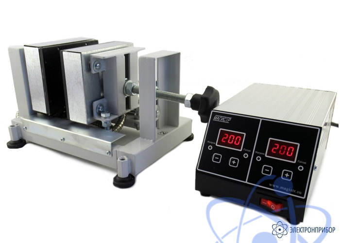 Установка содержит два вертикальных нагревателя установленных параллельно друг другу с возможностью регулирования зазора между ними. Контроль и задание температуры нагревателей осуществляется с помощью двухканальго цифрового блока управления.