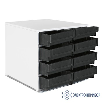 Тумба-сегмент поворотной стойки СП-01/C-2 ESD антистатическое исполнение, состоит из металлической тумбы 395 × 400 × 400 мм с 8 широкими пластиковыми кейсами, размещенными на 4 полках. Вес 9,5 кг.