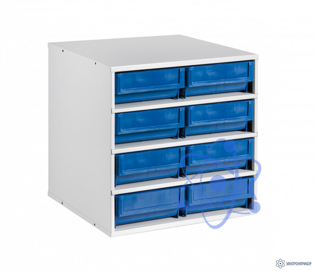Тумба-сегмент поворотной стойки СП-01/C-2, состоит из металлической тумбы 395 × 400 × 400 мм с 8 широкими пластиковыми кейсами, размещенными на 4 полках. Вес 9,5 кг.