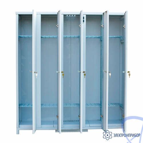 Каждая секция шкафа снабжена двумя съемными сетчатыми полками, на которые можно укладывать для сушки рукавицы, головные уборы или обувь. К сетчатым полкам можно так же подвешивать плечики с одеждой. Каждая секция шкафа закрывается дверью с почтовым замком.