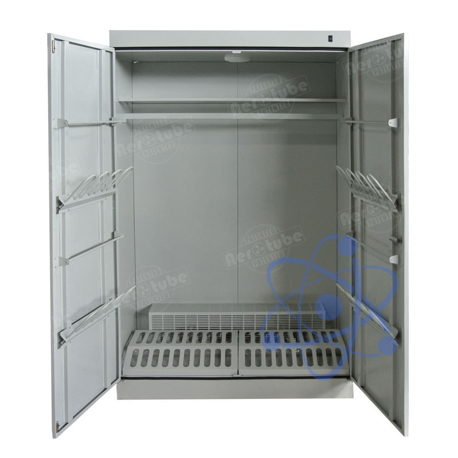 Поток теплого воздуха, создаваемый в сушилке от водяного теплообменника, циркулирует внутри объема сушильного шкафа, тем самым обеспечивает эффективный процесс просушивания одежды и обуви за минимальное время и с минимальными энергозатратами. Сушильный шкаф не сжигает кислород, безвреден для здоровья и рекомендован к использованию во внутренних бытовых помещениях различного назначения: