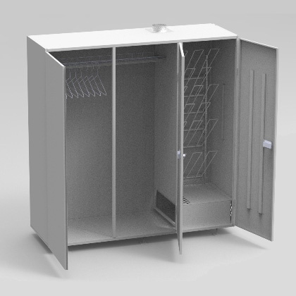 Воздушно-сушильный шкаф для спецодежды и обуви (СКС), применяется для просушки различного количества комплектов спецодежды и обуви. СКС эксплуатируется в любое время года. У камеры низкое энергопотребление 1,3 кВт/ч 220В, а также отсутствует перегрев наружных поверхностей за счет применения современного теплоизоляционного материала. Тепловентилятор нагнетает воздух 360 м3/час, нагретый до 42 °С внутрь сушильного шкафа, затем влажный воздух выходит в вытяжные отверстия, расположенные в верхней части СКС. Сушильный шкаф разделен на обувной и вещевой отсеки, которые специально оборудованы лотком для головных уборов и вешалками для одежды и обуви. В зависимости от влажности, количества и вида спецодежды и обуви процесс сушки длится от 30 мин до 6 часов. Шкафы закрываются на ключ. Время работы тепловентилятора регулируется реле времени, установленном в шкафу управления.