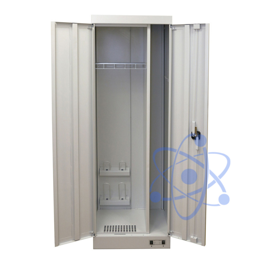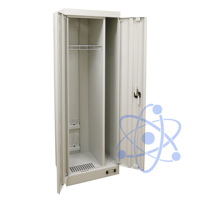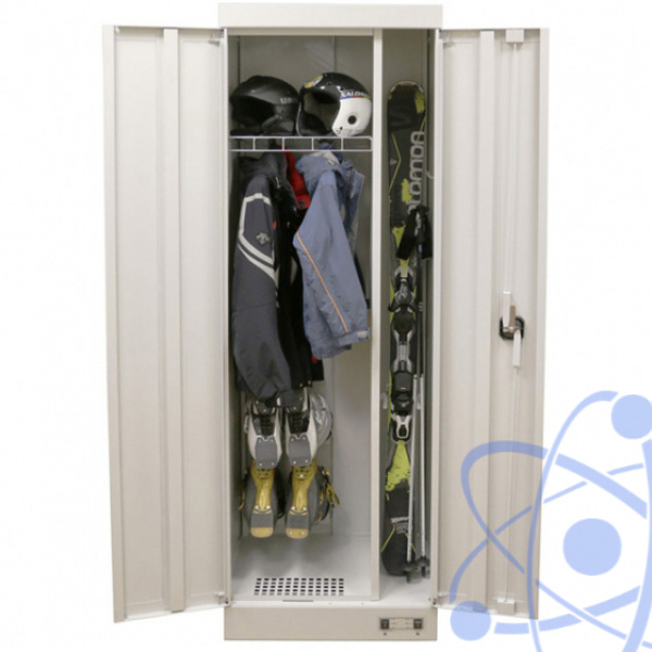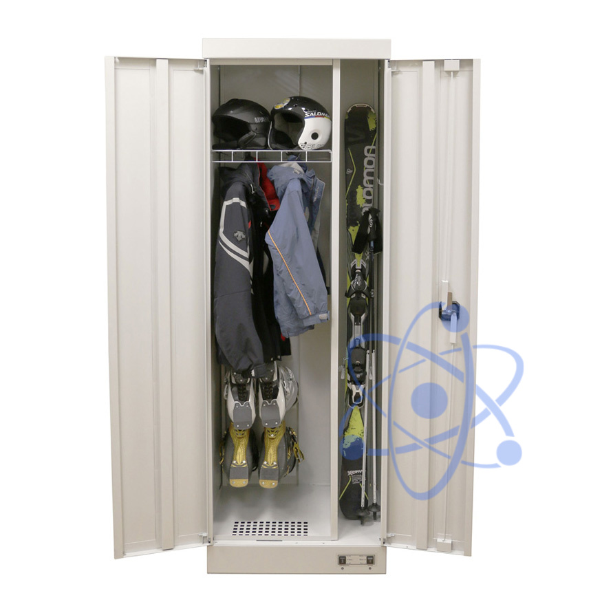 Верхняя часть корпуса разделена глухой перегородкой на отделение для сушки одежды и отделение для хранения спортивного инвентаря (например лыж) и закрывается двумя дверьми, в одной из которых установлен ригельный замок, запирающий одновременно обе двери. Внутри отделение для одежды снабжено съемной сетчатой полкой для подвешивания плечиков с одеждой, держателями для обуви и перчаток.