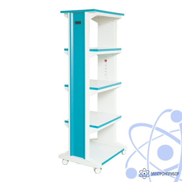 Стойка предназначена для размещения дополнительного оборудования и перемещения элементов в рабочей зоне. Оборудована пятью полками и встроенной электромонтажной панелью с 5 розетками и выключателем. Стойка оснащена четырьмя колесными опорами, две из которых имеют механизм фиксации.