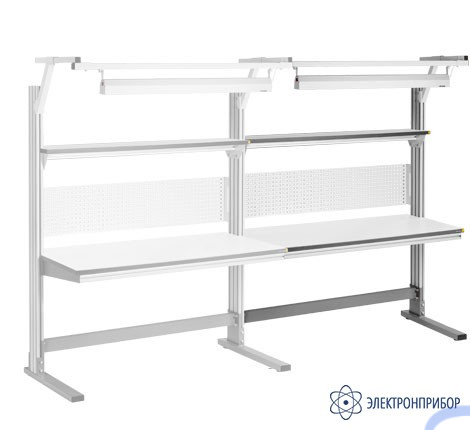 Стол комплекта АЛ/Д-15-7 ESD является приставным к основному столу серии АЛЬЯНС, позволяя создавать непрерывное рабочее пространство из основного и одного/нескольких дополнительных столов. Установка дополнительного стола осуществляется посредством его крепления к основному столу АЛЬЯНС справа или слева и к входящей в комплект 1 боковой алюминиевой стойке с противоположной стороны. Комплект поставки: стол с 1 боковой стойкой, перфорированная панель,нижняя планка, полка для оборудования и светильник (или светодиодный светильник). Максимальная нагрузка – 200 кг. Антистатическое исполнение.