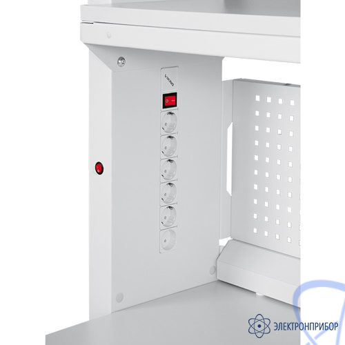 Стол рабочий ГМ-15-7/Л ESD поставляется в комплекте: стол рабочий с боковыми стойками, основная полка, верхнее освещение, верхняя и нижняя перфопанели и боковой энергоблок. Быстросъемные боковые панели обеспечивают удобство доступа к внутренним коммуникациям. Возможна поставка в 2 модификациях – с правым (ПР в артикуле) или левым (Л в артикуле) энергоболоком в боковой панели. Встроенный энергоблок имеет 6 розеток и кнопку выключения.