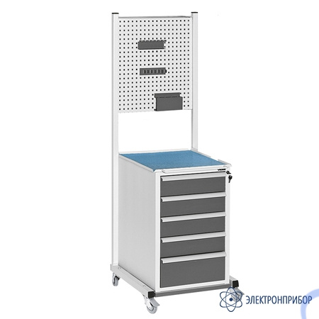 Стойка оснащена двусторонней перфорированной панелью 525х600 мм, которая выдерживает максимальную допустимую распределенную нагрузку в 10 кг. Возможно размещение держателей и крючков различной формы на панели. В качестве нижней части стойки установлена стальная тумба, оборудованная пятью выдвигающимися на 360 мм ящиками с телескопическими направляющими. Снабжена 4 колесными опорами, 2 с механизмом фиксации. Только в общепромышленном исполнении.