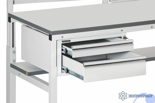Стальная тумба ТП-20/П  в качестве дополнительного элемента рабочего стола подвешивается под его столешницей и используется для хранения инструментов и компонентов. Оснащена центральным замком. Имеет выдвижные ящики с механизмом легкого скольжения (телескопические направляющие), выдвигаются на 550 мм. Внутренние размеры ящиков (Ш х В х Г) следующих типоразмеров 400×45×430 мм и 400×100×430 мм. Нагрузка на ящик — до 30 кг.