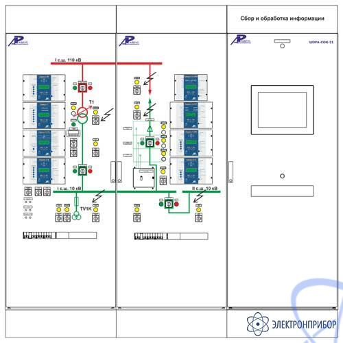 Для объединения всех терминалов «Сириус» в локальную сеть с возможностью удобного наблюдения за токами и напряжениями, подводимым ко всем терминалам, просмотра и изменения уставок, считывания событий и срабатываний, а также осциллограмм с их просмотром на экране компьютера, рядом со стендом устанавливается шкаф ШЭРА-СОИ с промышленным компьютером, встроенным сенсорным экраном, клавиатурой и различными интерфейсами связи. На компьютере устанавливается программа «Старт-2ПС» – система АСУ ТП объекта, или «Старт-3» – АРМ инженера-релейщика.