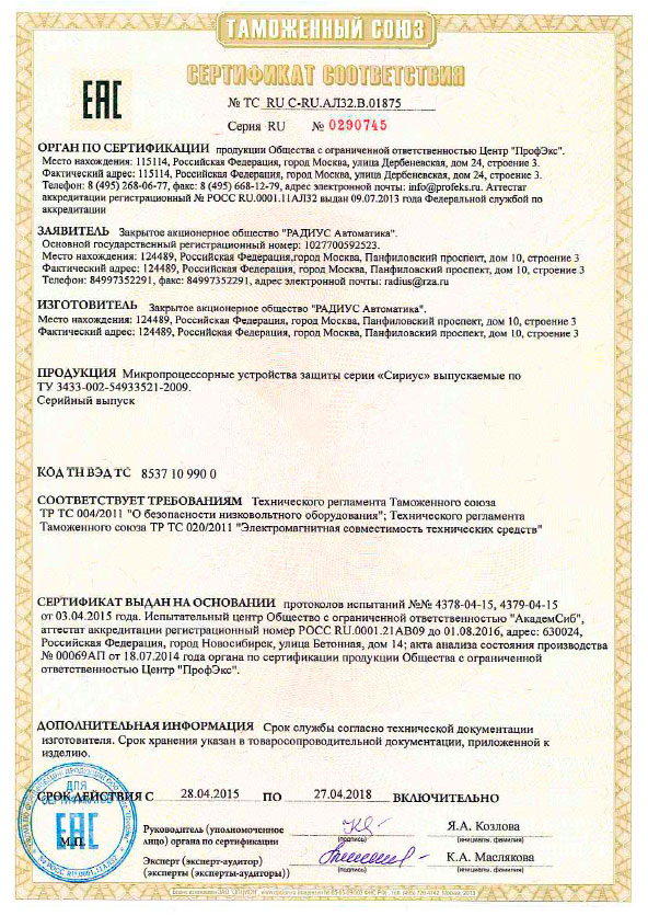 На основании лицензий на конструирование и изготовление оборудования для атомных станций, полученных ЗАО «РАДИУС Автоматика», устройство допускается для применения на атомных станциях.