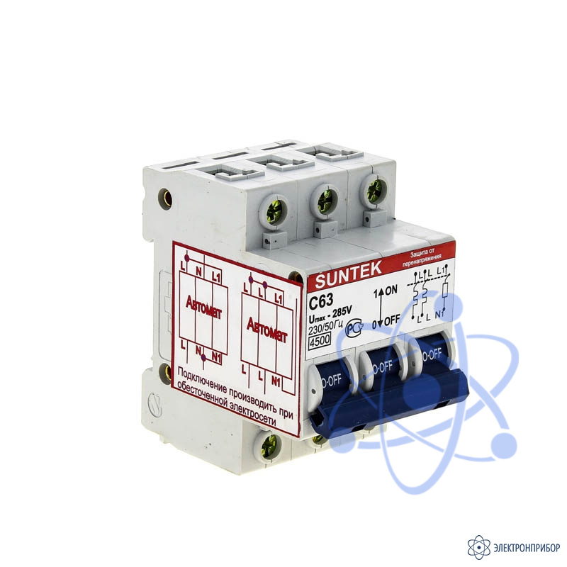 SUNTEK-C – трехмодульный автоматический выключатель с установкой на DIN-рейку. Первые два модуля выполнены как автоматические выключатели, которые срабатывают от токов короткого замыкания. В третьем модуле встроенный блок контроля и выключения. Устанавливается на вводе эл. энергии. При трехфазном питании устанавливаются на каждую фазу.
